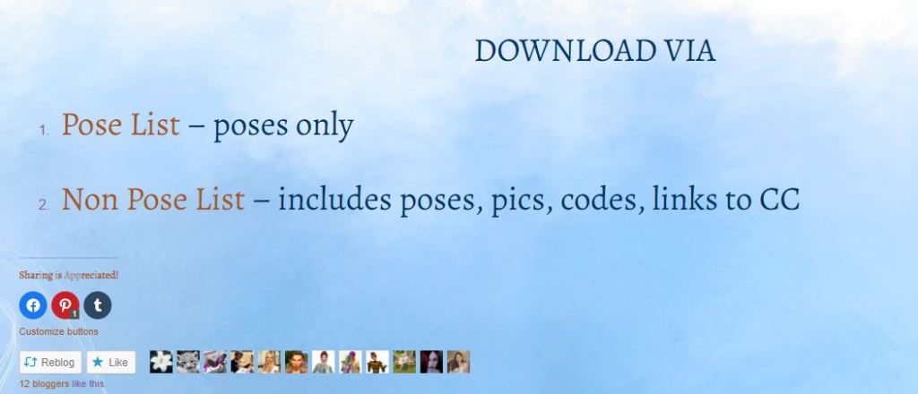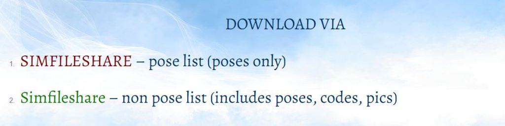 All of 2021 posts, have both pose list and non pose list files, and I am finishing up 2020 with 16 sets left to correct. If you are unsure about whether a set has had a non pose list download added, it will look like this on my site: