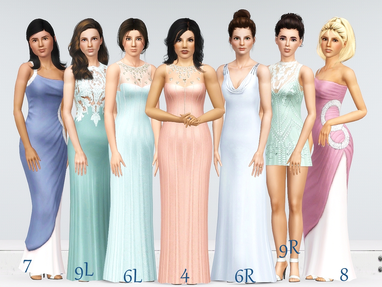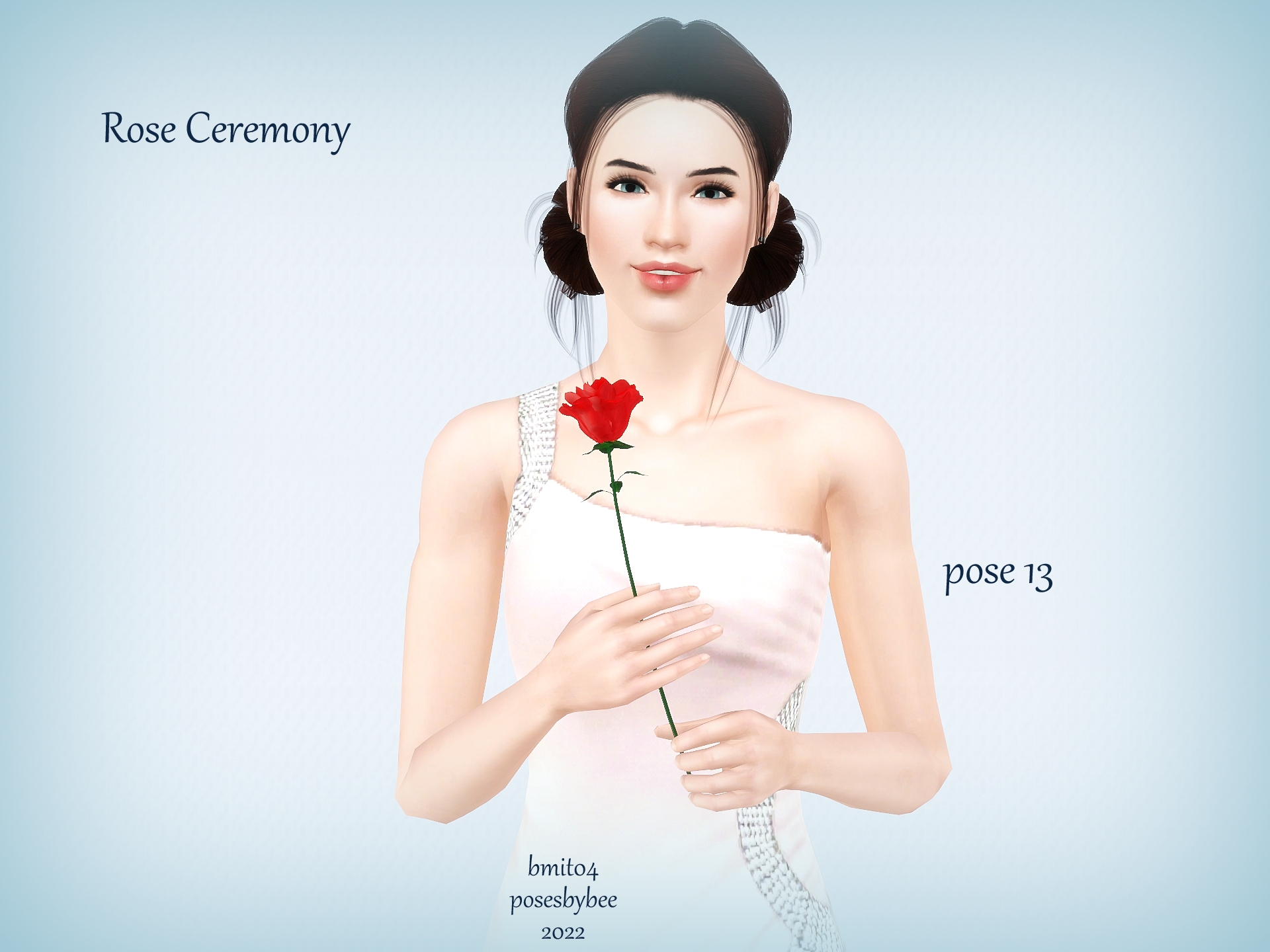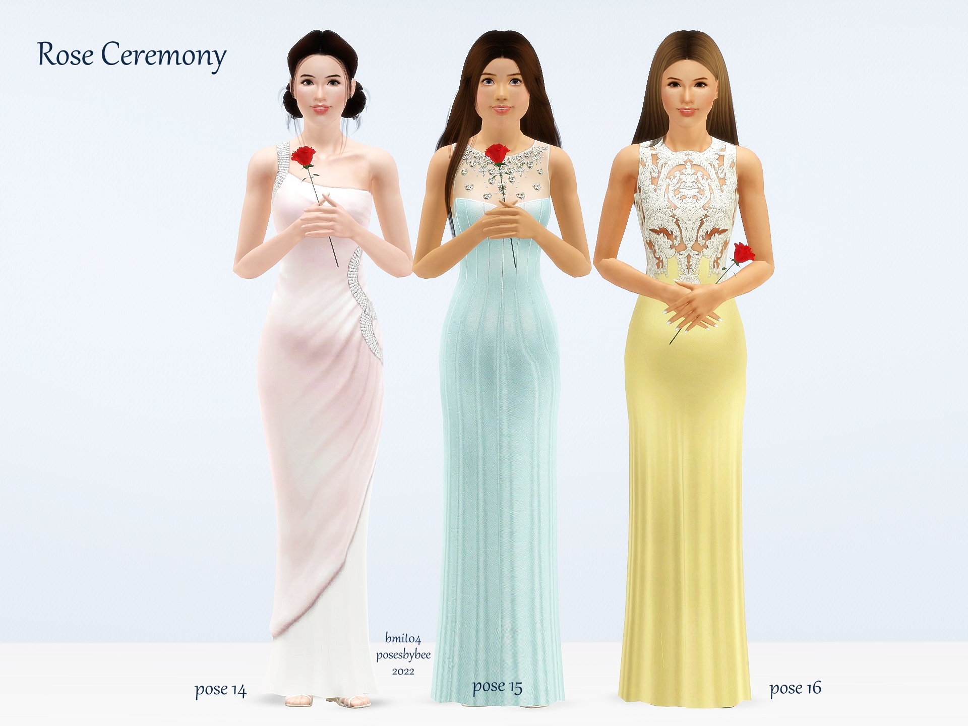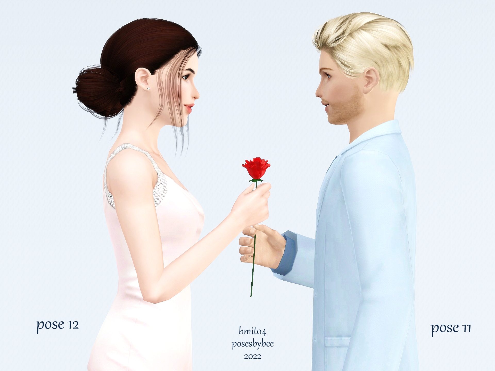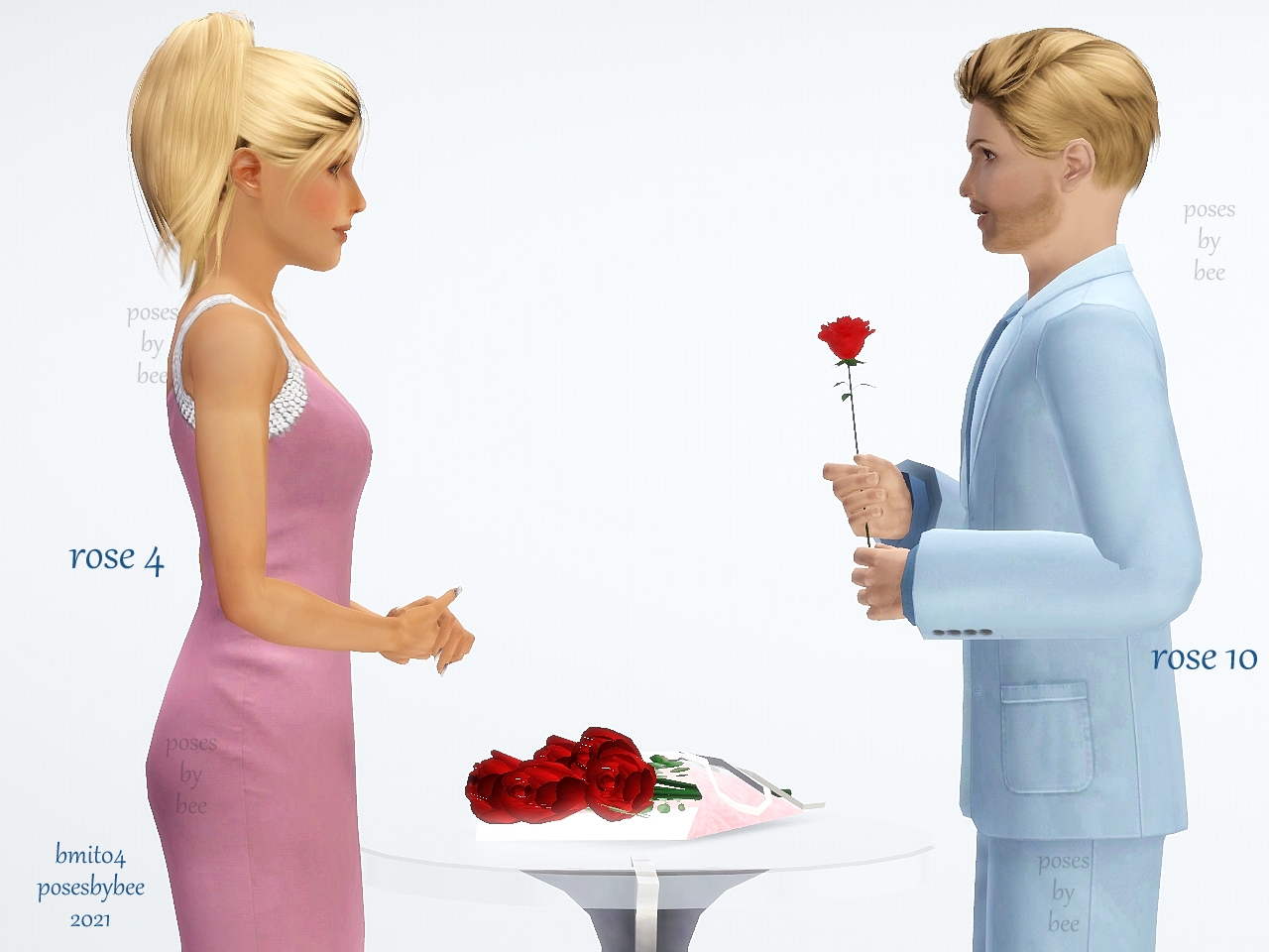 This set is meant to be interchangeable.  I have shown you one possible set up of the sims in a group waiting for a rose.  Poses 2, 3, 4, 6 and 9 are center poses.  Choose which one you want for the pic or the moment.  The poses marked with “L” go the the left of the center pose.  Poses with “R”, go to the right of the center pose.  Pose the groupings of sims however you like.