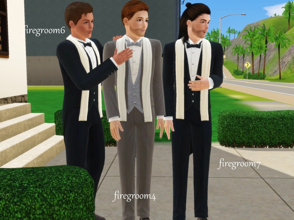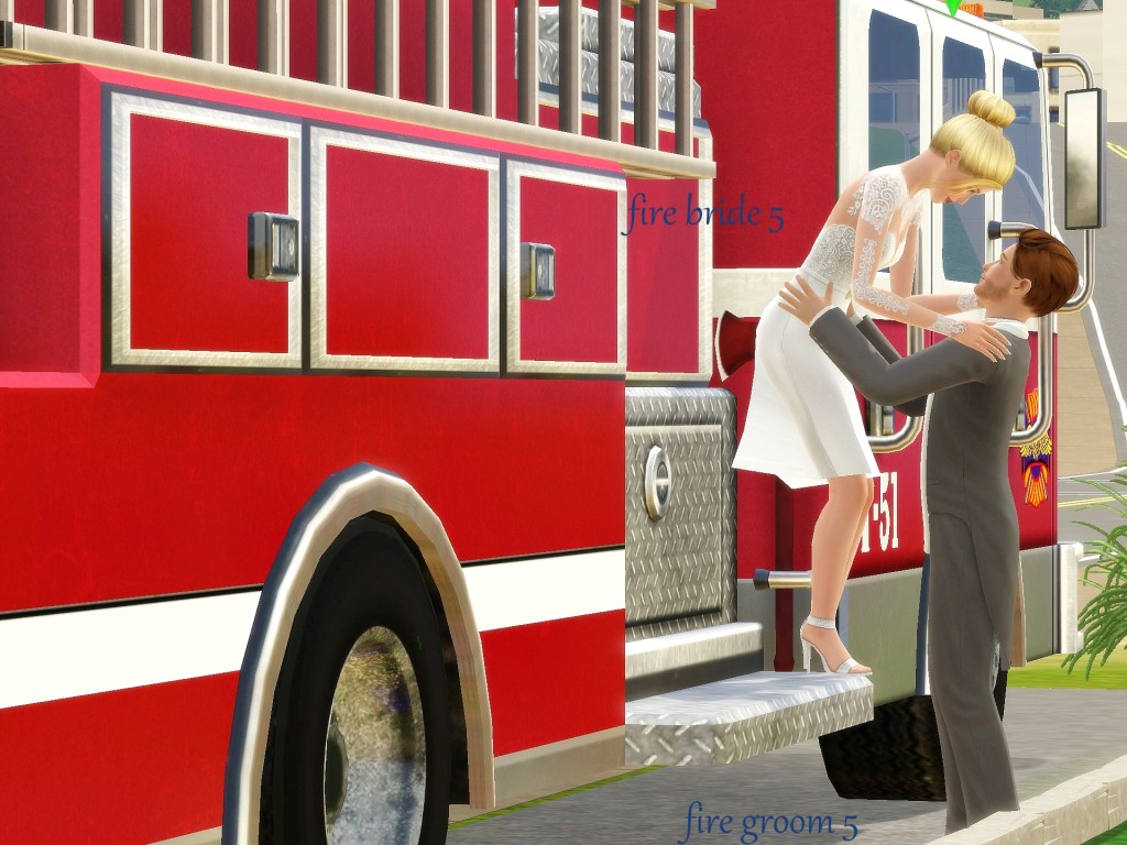 This set was requested for a story at booomcha.com.  The bride is left behind with no way to get to the church.  A firetruck driving by comes to the rescue.  The bride is nervous at first but then starts enjoying the ride.  She arrives at the church where the groom and his men are waiting, concerned that she hasn’t arrived.  Laughing when they see her get there.