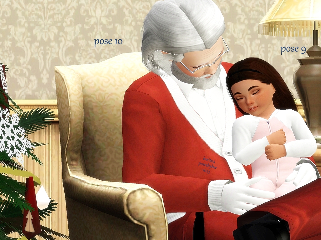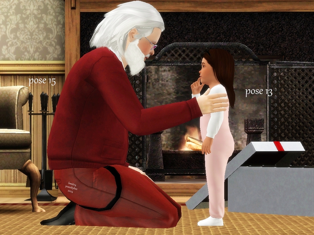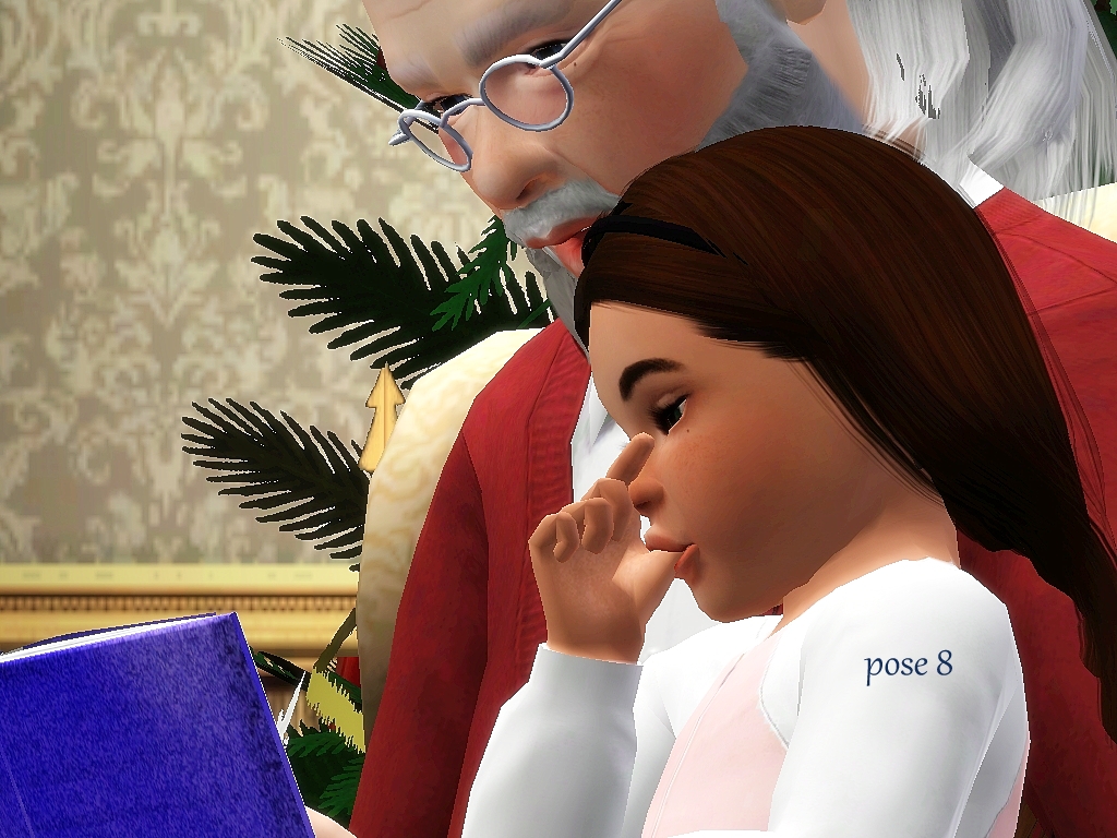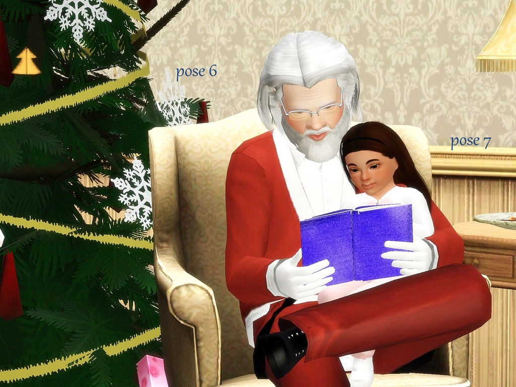 Santa is trying to leave a puppy as a gift for a toddler, but the puppy is way too excited, waking the toddler.   Santa reads a story to the toddler, to get them asleep again.  Poses could be used for a grandfather and toddler as well.