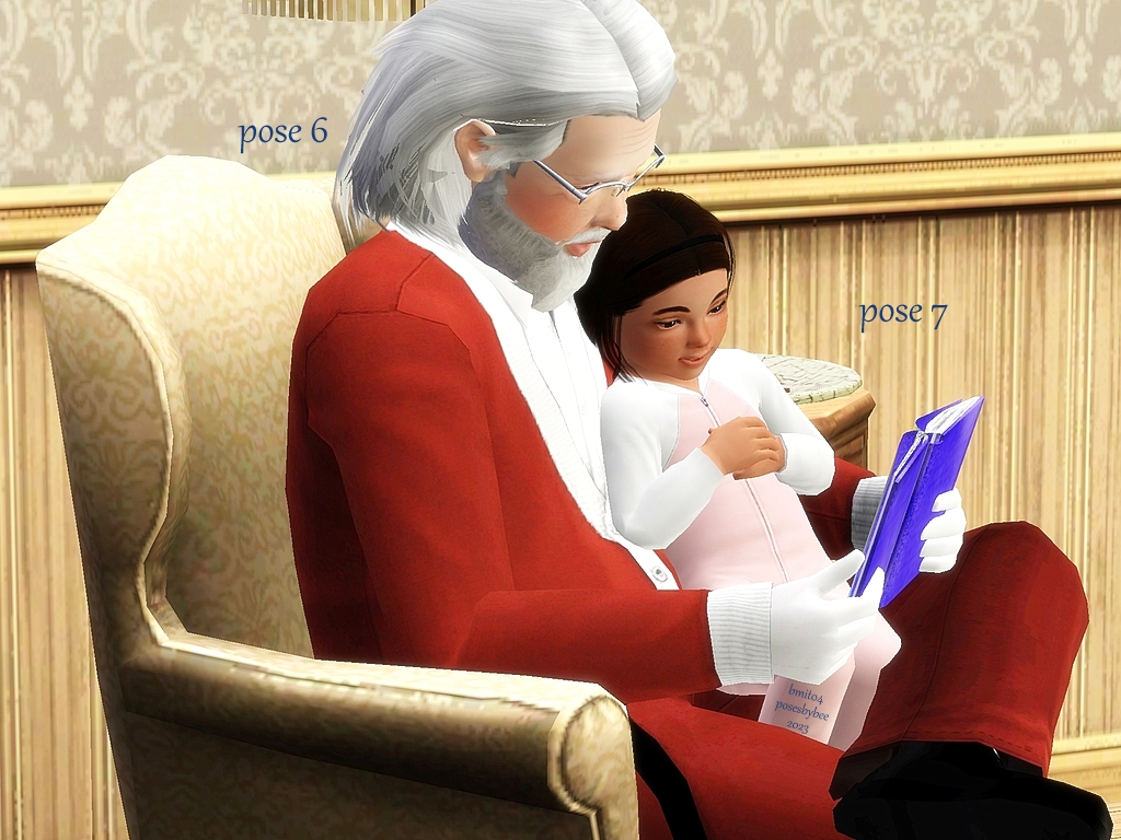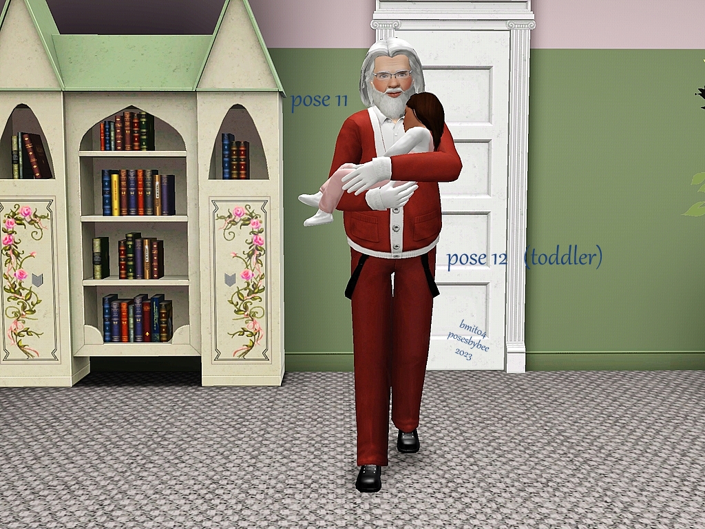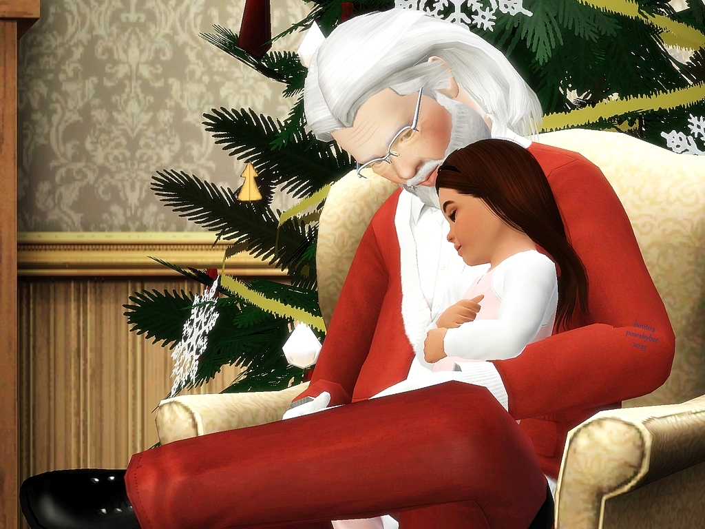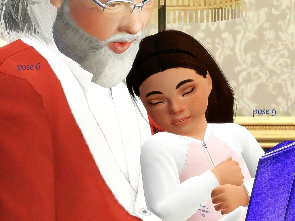 Santa is trying to leave a puppy as a gift for a toddler, but the puppy is way too excited, waking the toddler.   Santa reads a story to the toddler, to get them asleep again.  Poses could be used for a grandfather and toddler as well.