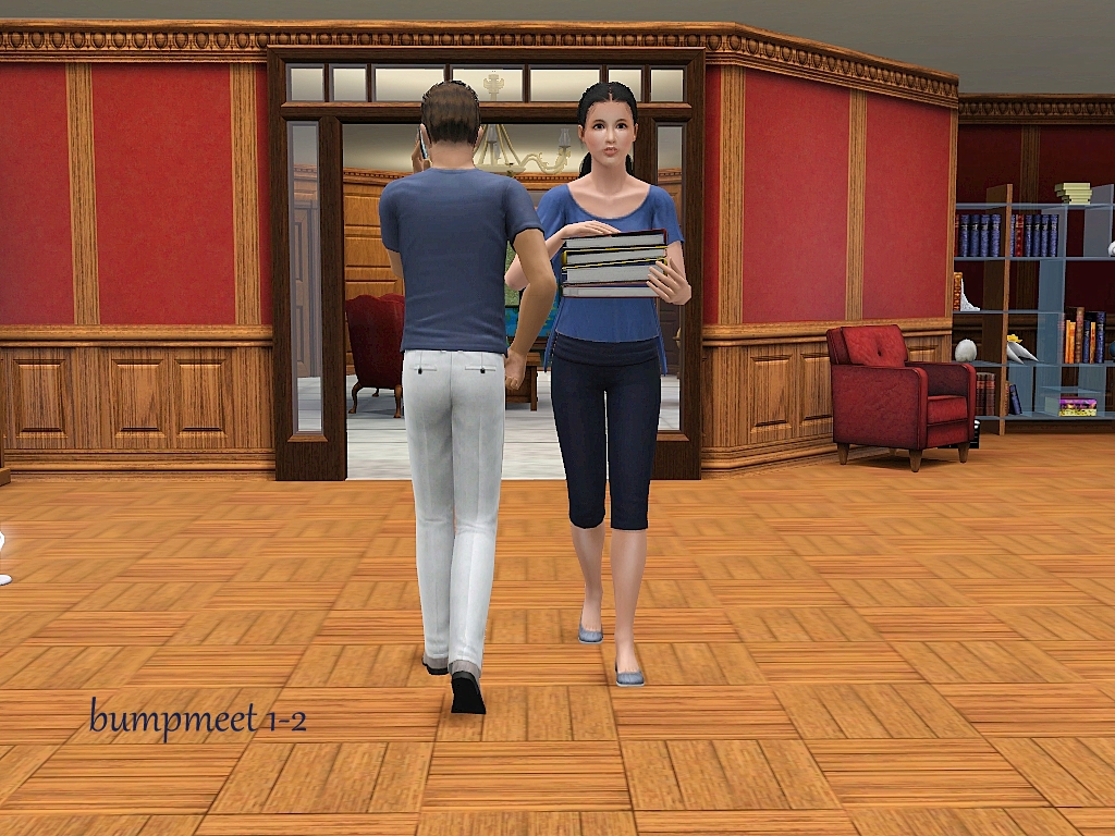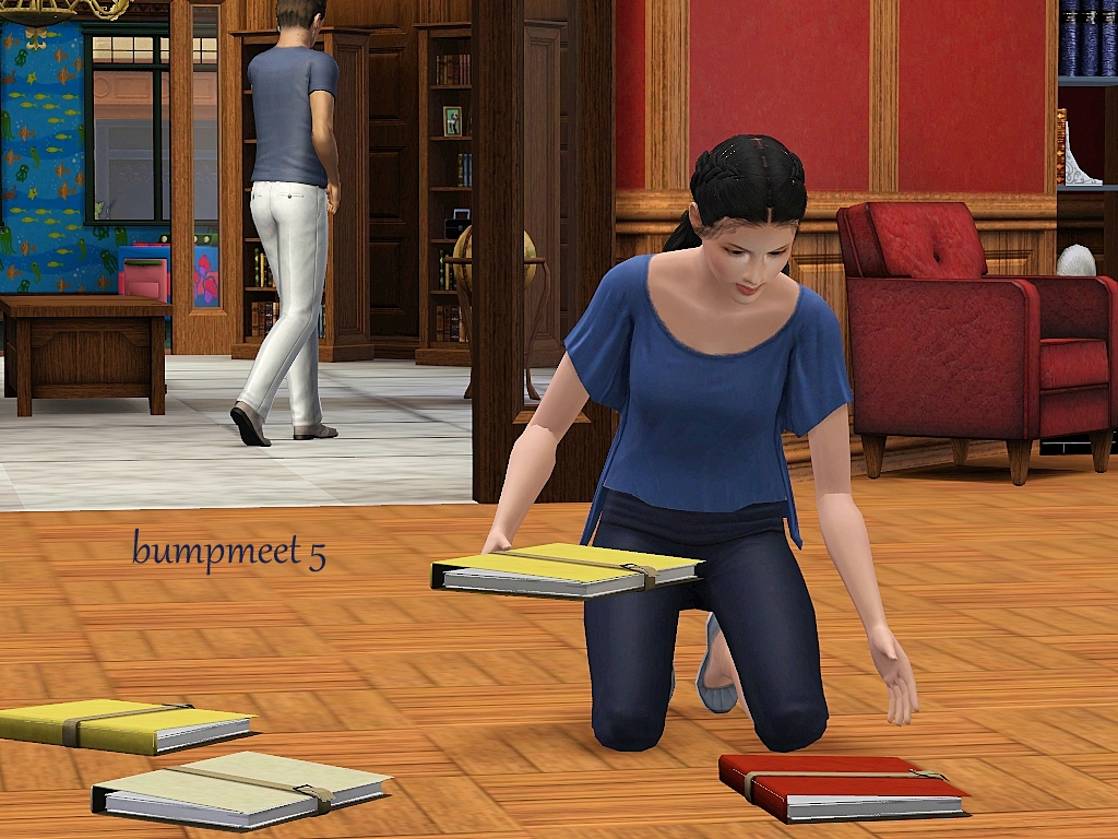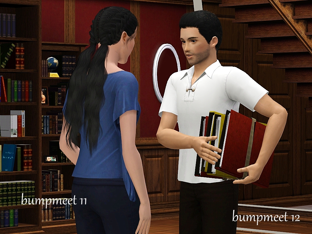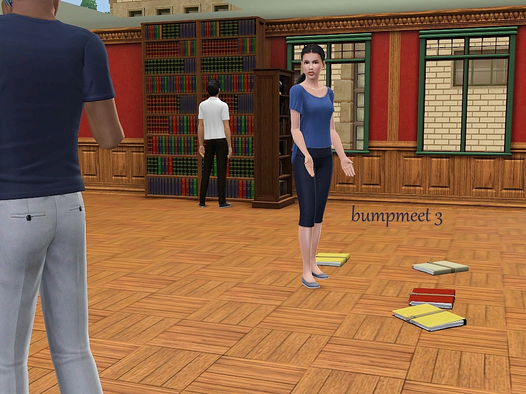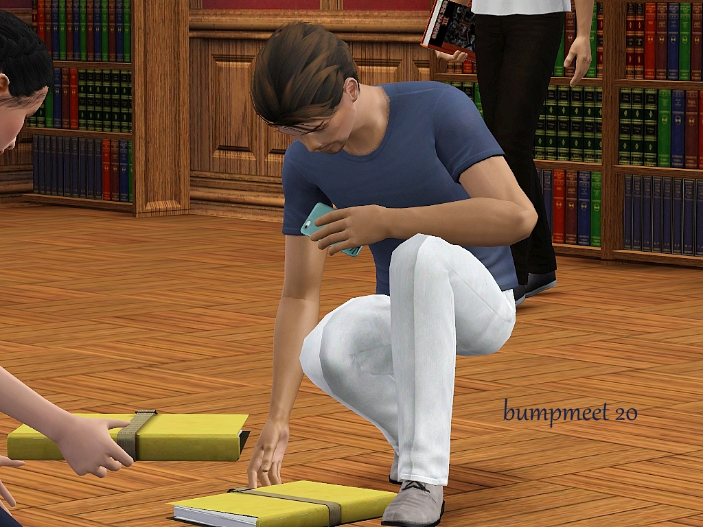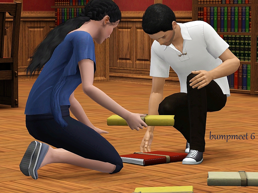 One of my followers mentioned that meeting in a library, office or university would be a good idea.  This thought was the first thing that came to mind and when I went looking for CC I found these books at #ATS3.  Both in a pile and individual books.  With that discovery I was super excited to make it! Thank you Sandy!! I did sneak a pose on the end of the sim who bumped coming back to help pick up the books.  Mix some of these poses up more than I have shown.  Please be advised, lining up this CC with the pose will be a challenge.